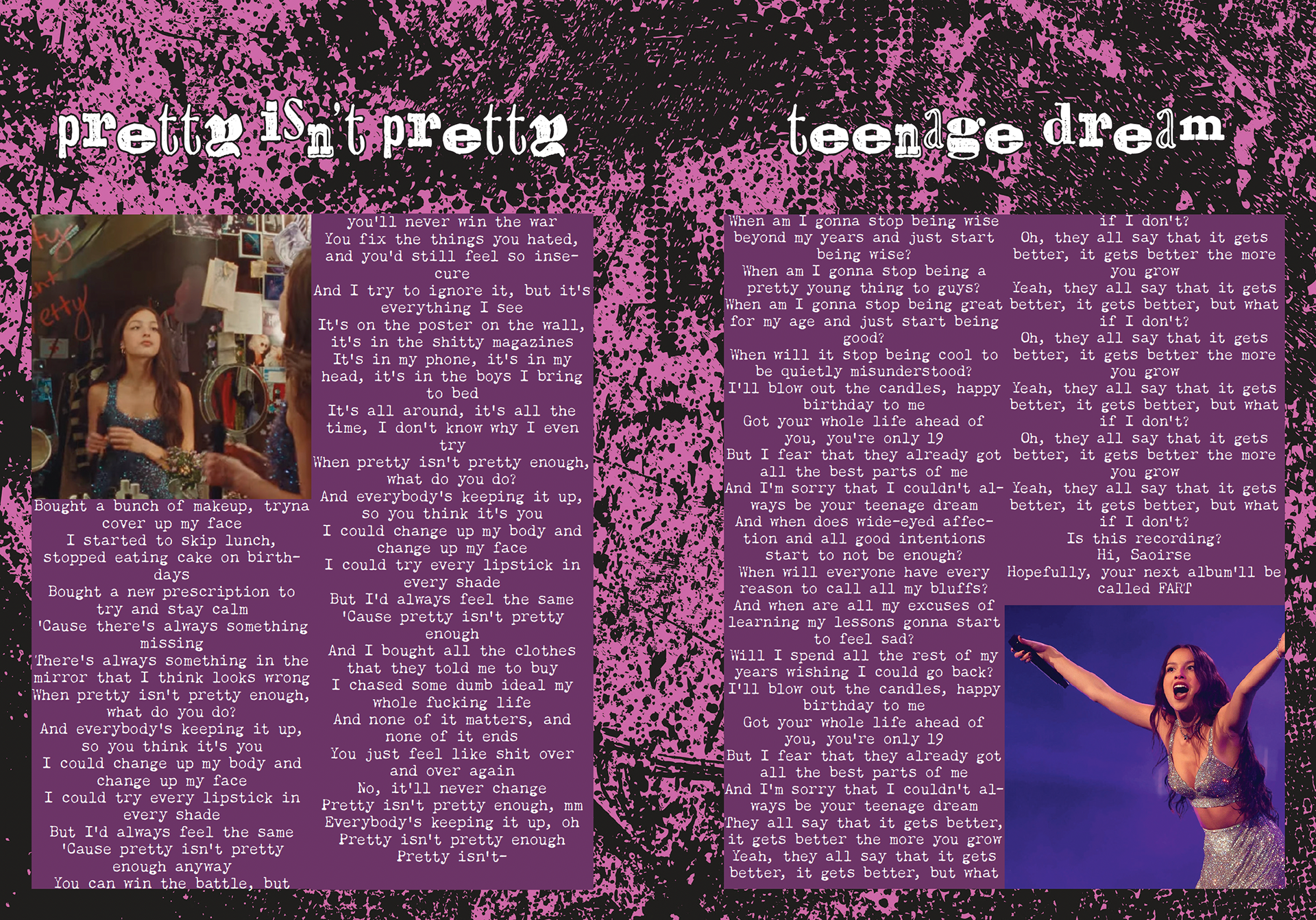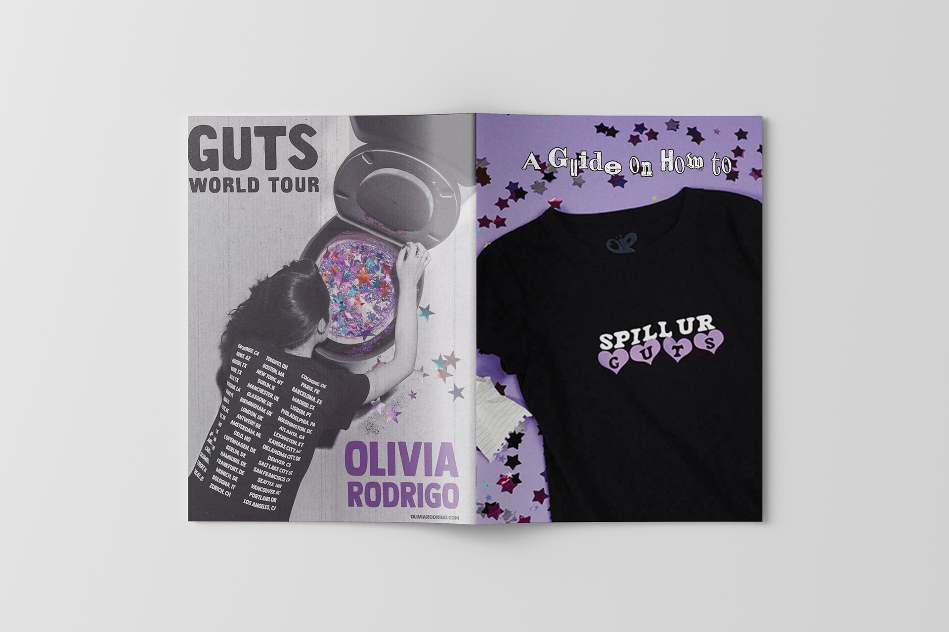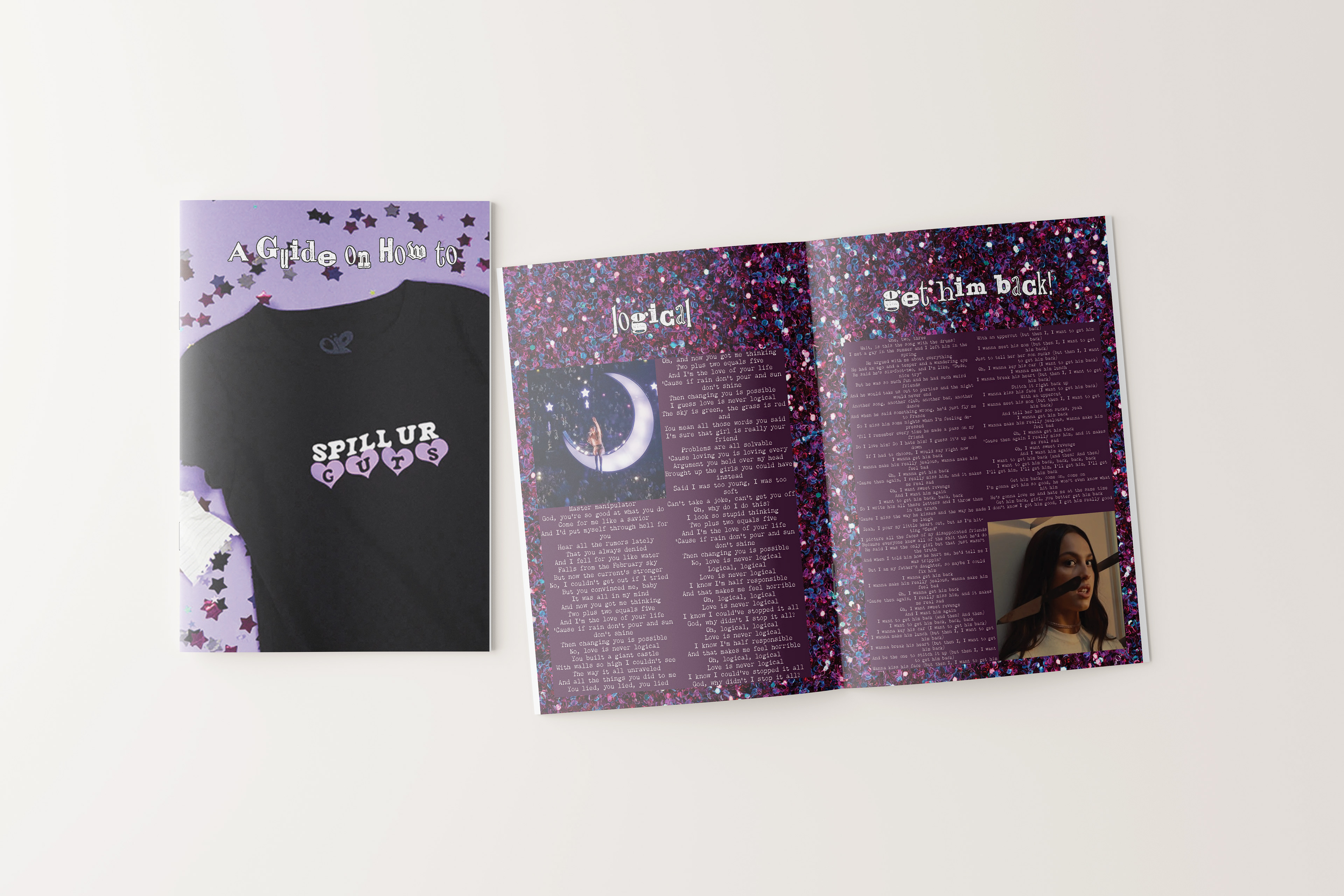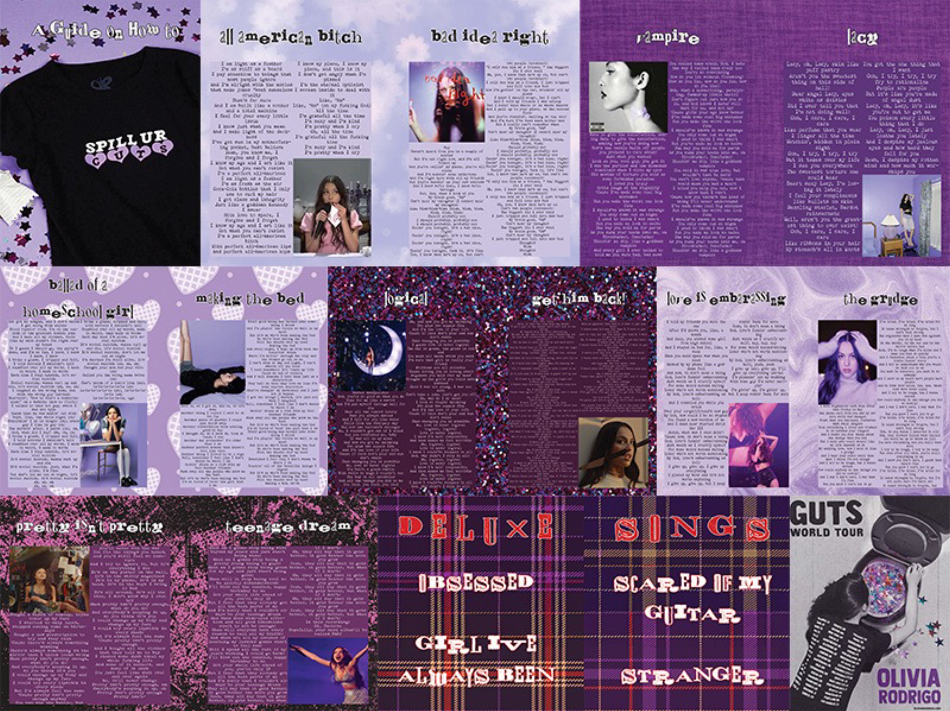 A lyric book for Olivia Rodrigo's Sophomore Album, GUTS. Intended to be passed out during the GUTS tour during the show so the audience has a memorable keepsake.
