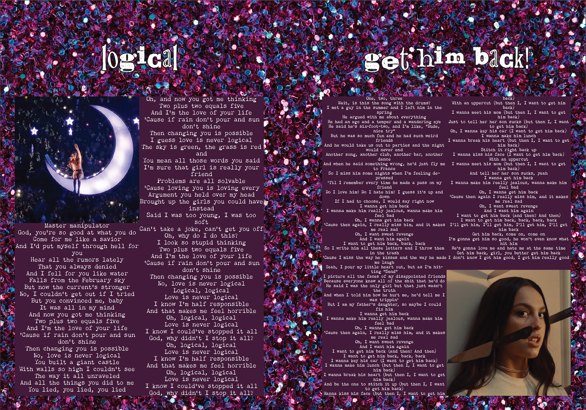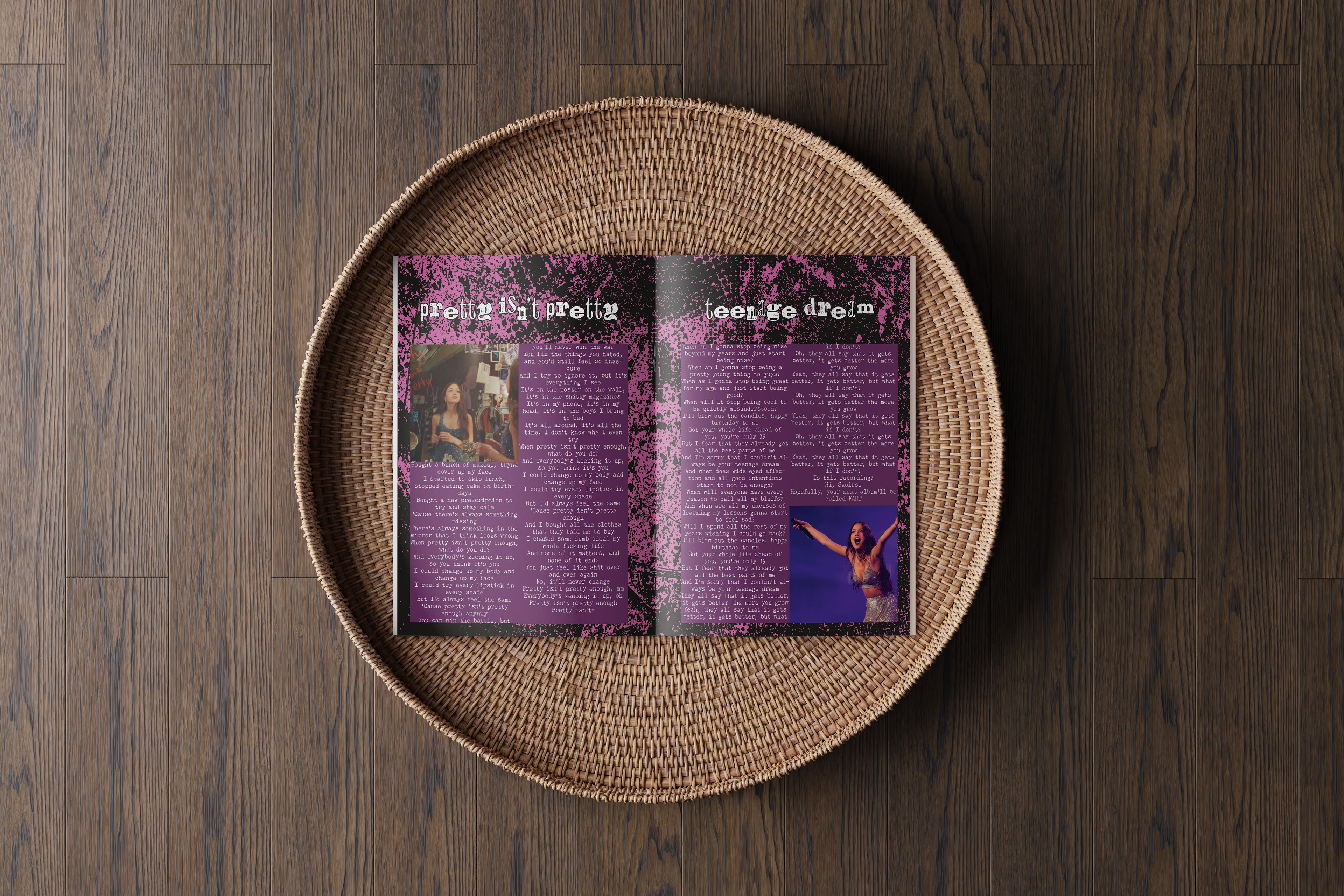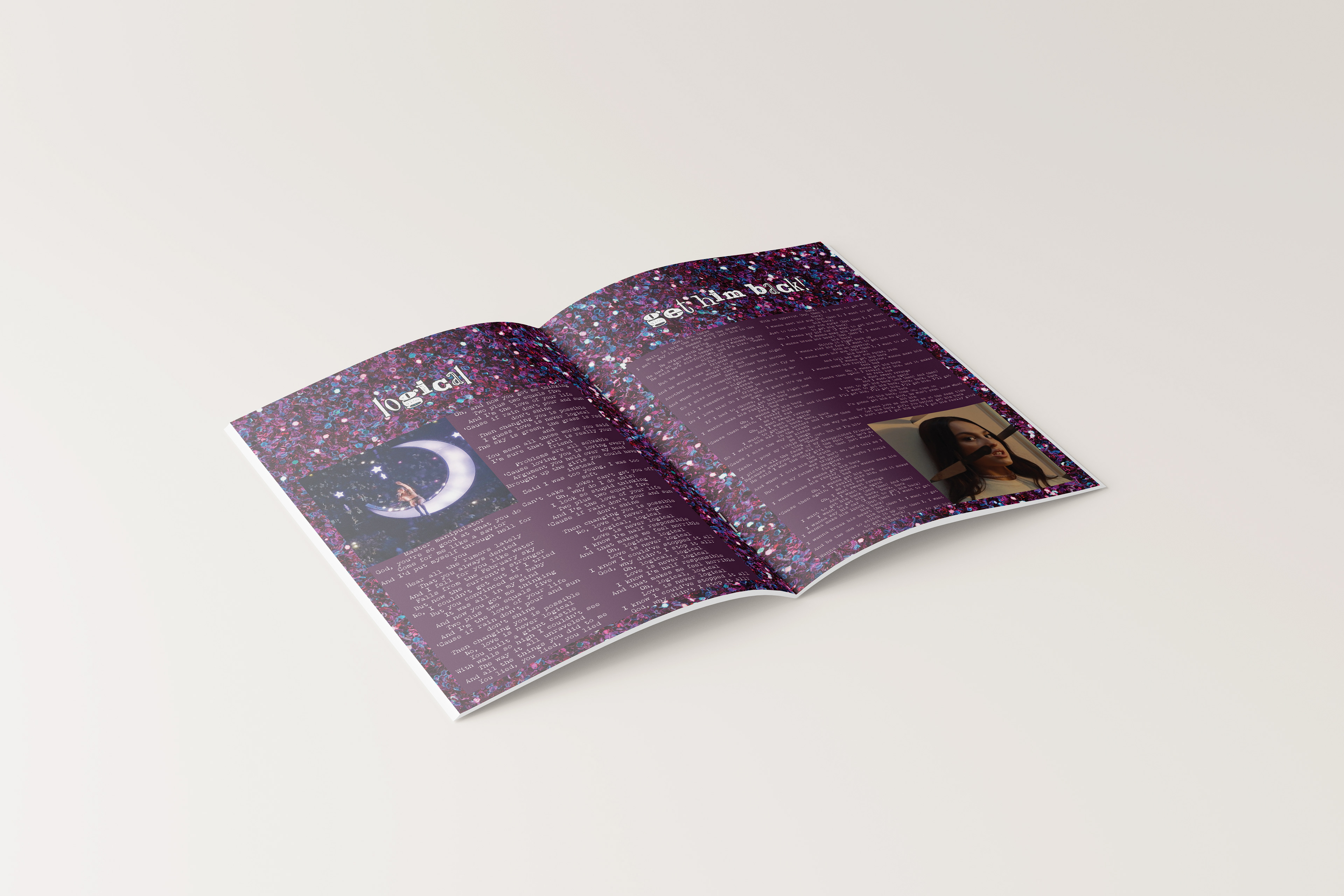 A lyric book for Olivia Rodrigo's Sophomore Album, GUTS. Intended to be passed out during the GUTS tour during the show so the audience has a memorable keepsake.